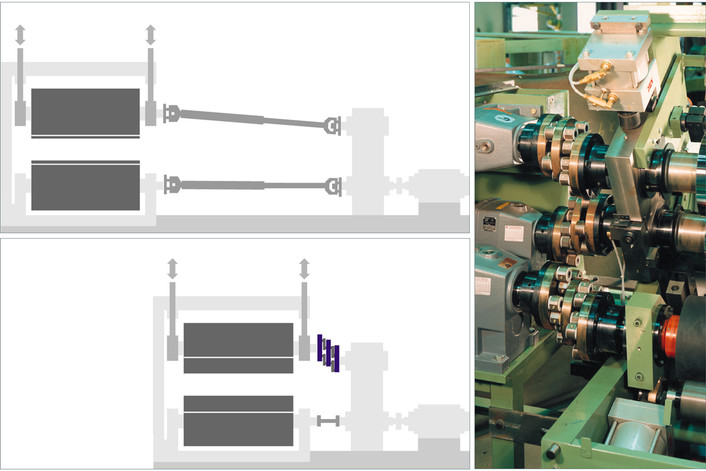 附图:各种滚筒驱动应用,例如各种涂装滚筒;可处理不同的材料厚度。在运行过程中,Schmidt-Kupplung联轴器可适应加工工艺中出现的可变功能性轴偏移,同时保持持续同步。